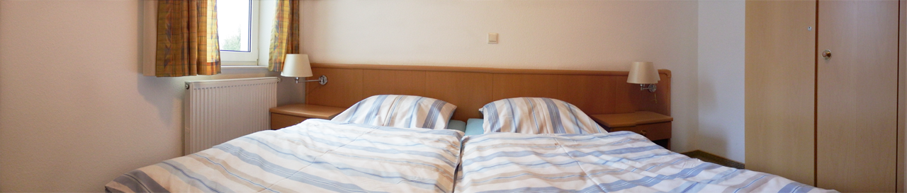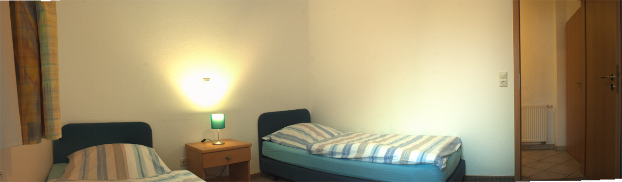 Im kleineren Schlafzimmer stehen Ihnen zwei Einzelbetten zur Verfügung. Diese lassen sich bei Bedarf zu einem Doppelbett zusammen schieben. Ihre Kleidung können Sie in einem Schrank mit zwei Türen verstauen. Auch hier lassen die Fenster dank eines Verdunklungsvorhangs kein Licht durch.