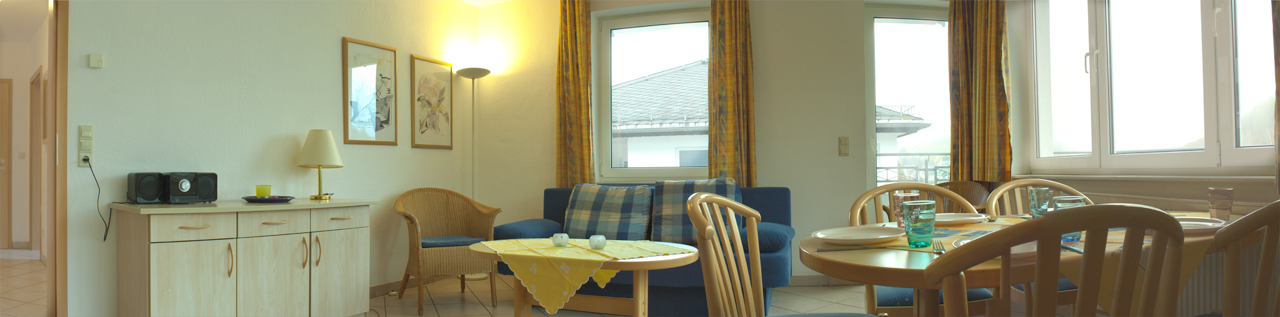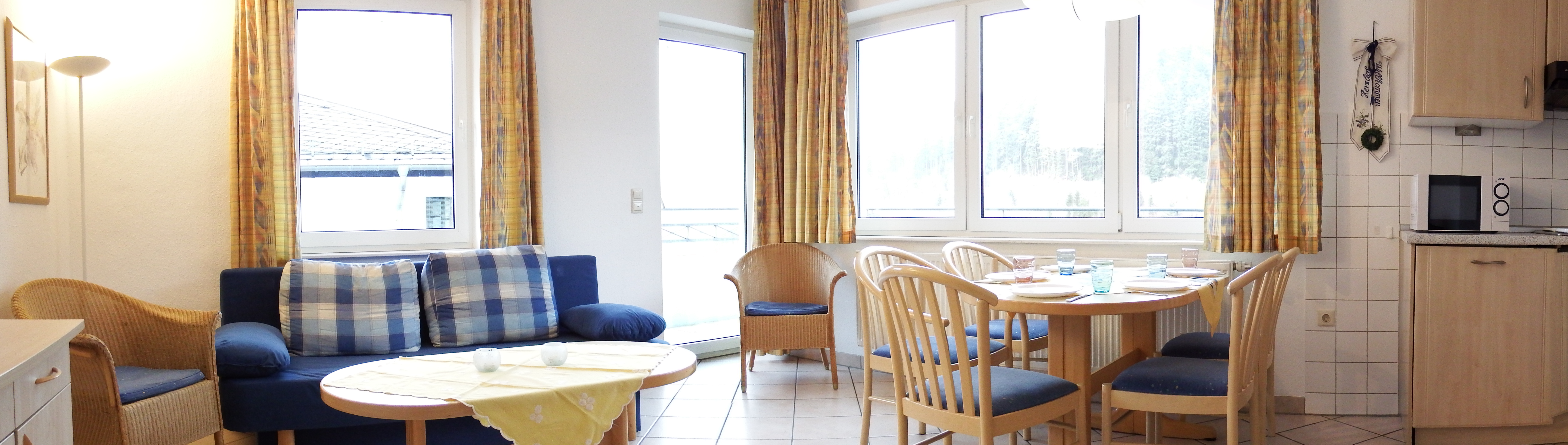 Die Wohnküche ist der zentrale Treffpunkt dieses Appartements. Mit seiner gemütlichen Couch und dem Esstisch, an dem 6 Personen bequem Platz finden, bieten sich ausreichende Sitzmöglichkeiten. Zudem können Sie hier fernsehen oder die CD-Anlage nutzen. Mit dem vorhandenen Sky Sportpaket können Sie sich immer über den Spielstand ihrer Lieblingsmannschaft informieren und verpassen kein für Sie wichtiges Sportereignis.